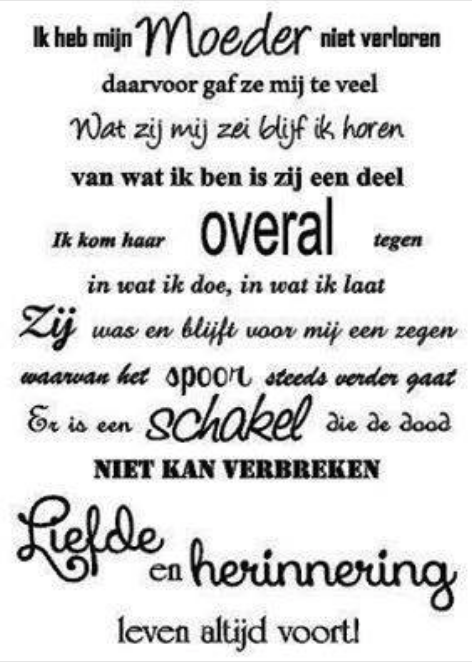 Ook al is het vandaag 20 jaar geleden onze herinnering is meer dan speciaal. Je was mijn inspiratie bron, samen konden we veel delen. Je was een moeder & vader in een, je ving het gemis op. Ook heb je pogingen onder nomen met mijn vader, hem laten weten wat hij allemaal miste. Maar er was helaas geen beweging in te krijgen.