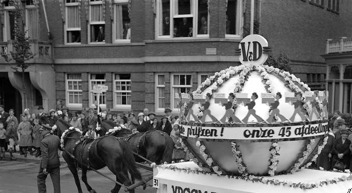 Praalwagen met daarop een grote kroon met reclame voor Vroom en Dreesmann met twee paarden ervoor met begeleiding van een man in uniform bij een park in Haarlem [waarschijnlijk tgv een winkeliersfestijn]. Nederland, datum onbekend [1930-1935].