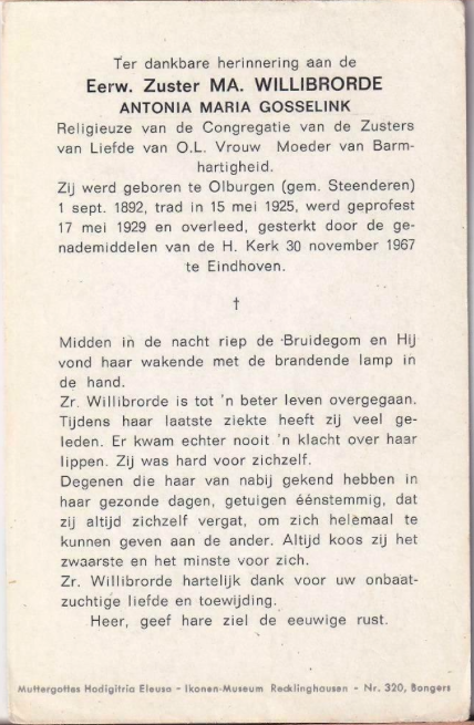 Dochter van Gosselink-Beugel, begraven Sint Joriskerkhof, Sint Jorislaan Eindhoven. In getreden bij de Zusters van Liefde aan de Schalmstraat in Eindhoven. Dit klooster werd in de jaren 70 gesloopt en er staat nu een groot bejaardenhuis. ” De Wilgenhof”. Zou mooi zijn om een foto van haar aan dit bericht toe te kunnen voegen.