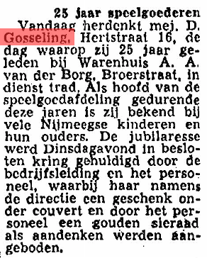 Gosselink. Do. Jubileum Gepubliceerd 25 februari 202225 februari 2022 door roots In 1928 ging ze werken bij van der Borg in Nijmegen. Ze werkte er met veel plezier.