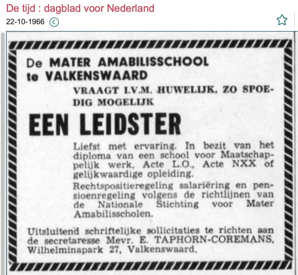 Dag Mieke, dat weet ik, in de tijd dat ik van Uw tante les had , Maastrichterweg…mevrouw Taphorn, geweldige tijd mee gehad, het waren zo n gezellige tijd mee gehad, toen ze zwanger was, vertelde ze daarover..en ik mocht als klassenleidster ook op kraam bezoek in het Wilhelminapark….lang geleden, heb in 1959 mijn diploma gekregen en ook nog met 2 vriendinnen contact, met een hartelijke groet, Ria