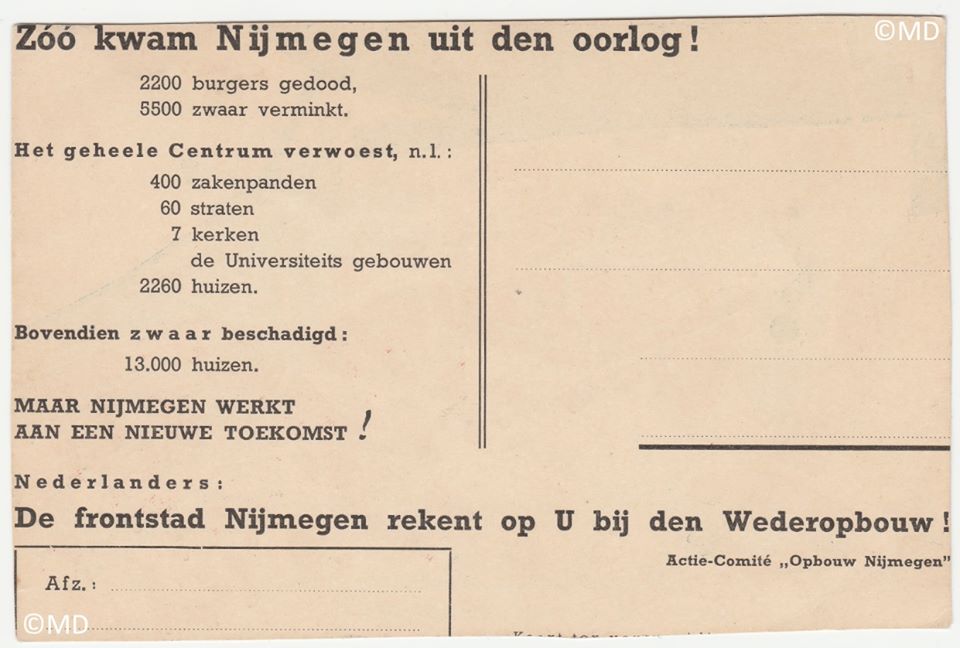 Ansichtkaartje uitgegeven in 1945 door Actie-Comité “Opbouw Nijmegen”, de opbrengst kwam ten goede aan de wederopbouw.